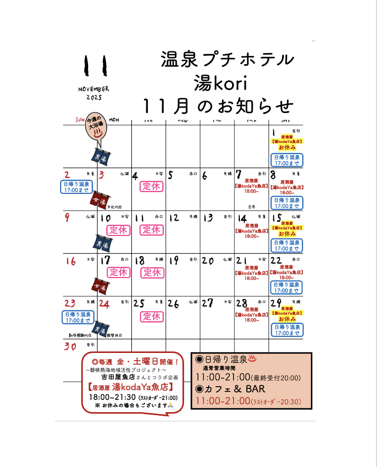 ▶︎11/15(土) ・29(土)湯kodaYaお休み