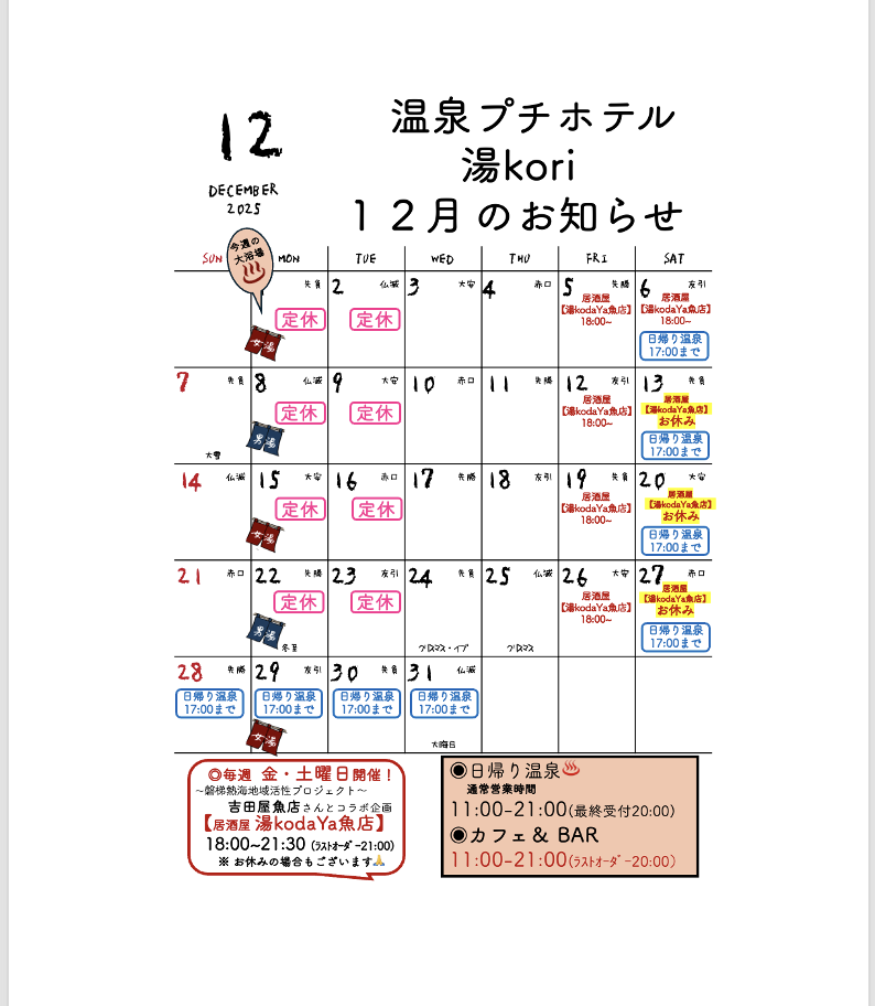 慌ただしくなる季節ですが少しだけ足を止めて湯koriの温泉でホッとひと息つきませんか♨️