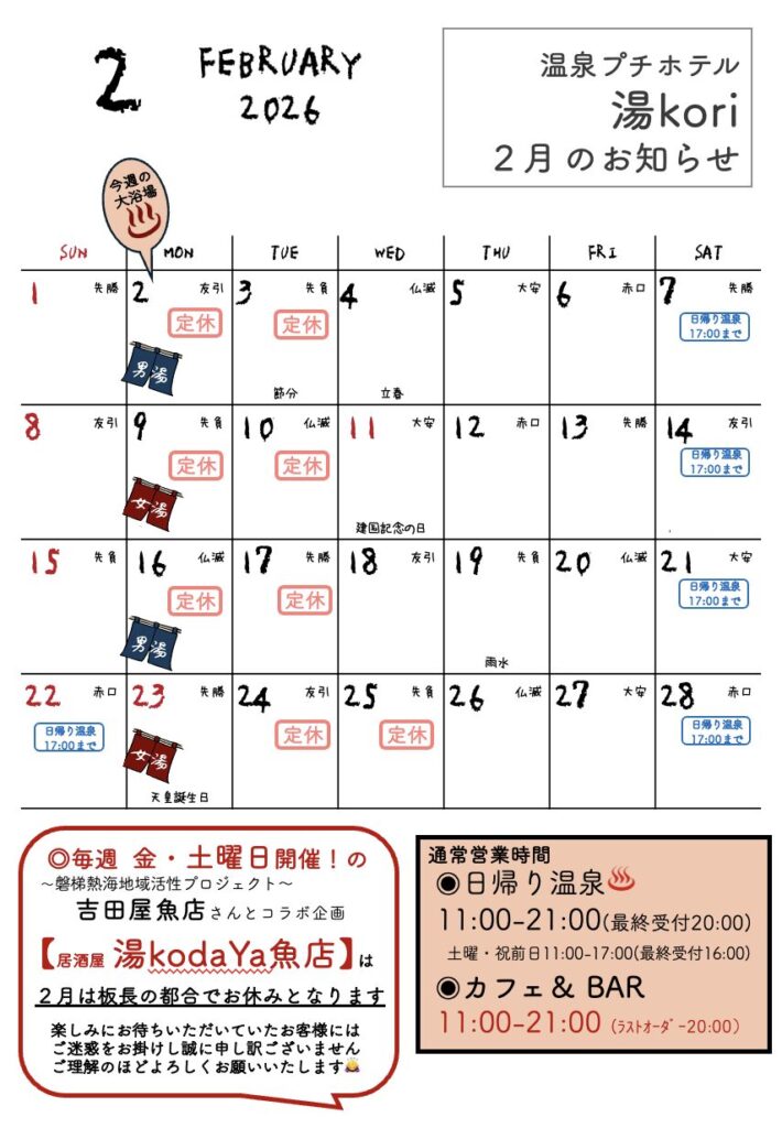 2月の営業カレンダーを更新しました|平日素泊まり最安値プラン販売中!