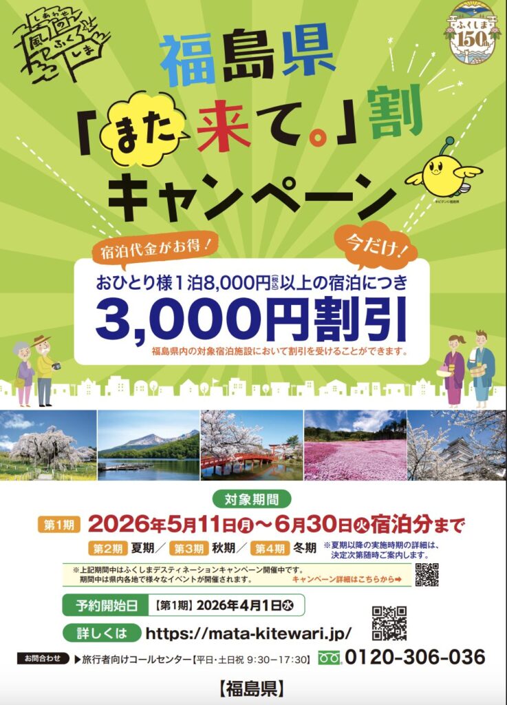 福島旅行をお得に楽しめるキャンペーン、【福島県「また来て。」割】の予約受付中です!